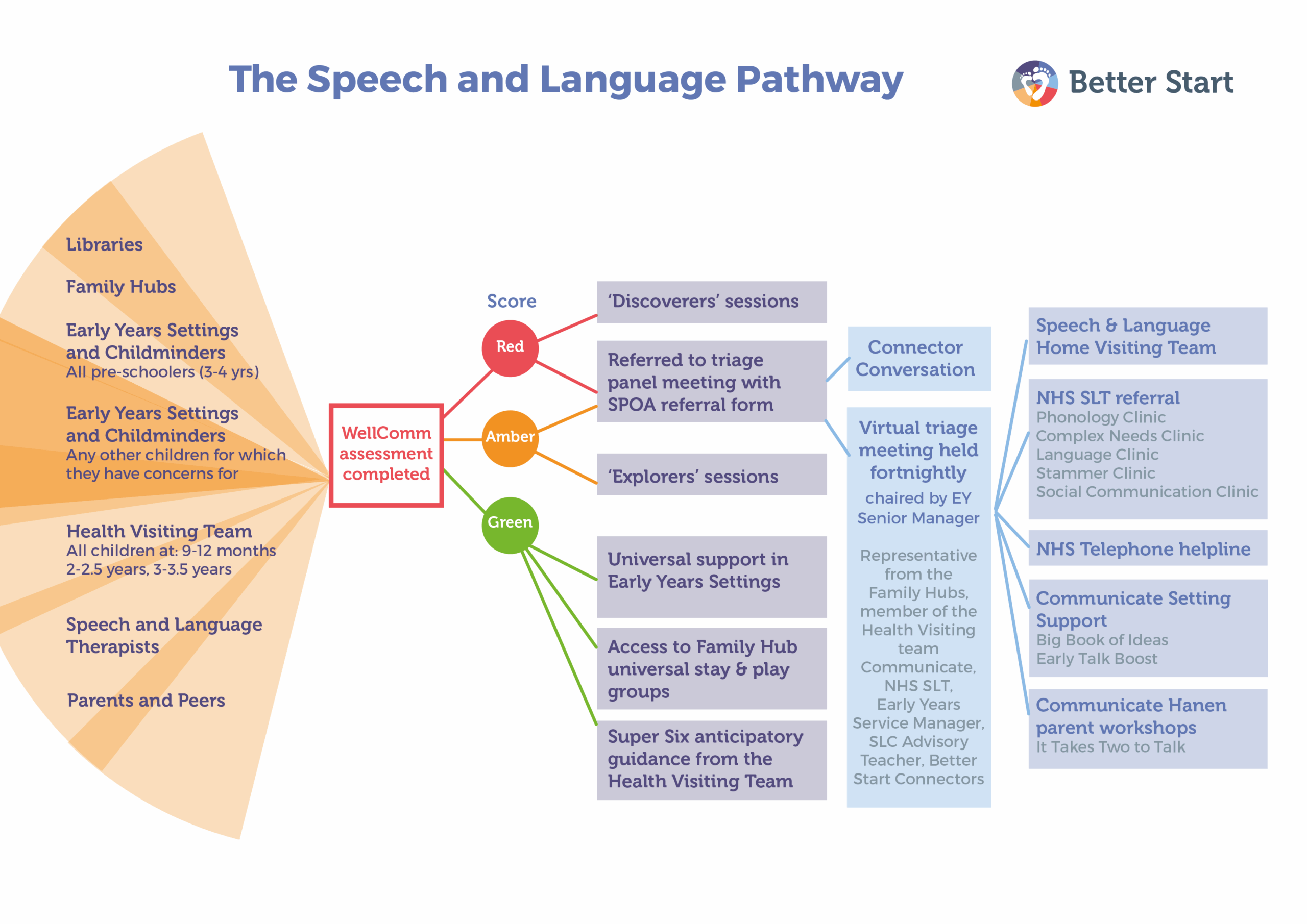- On completion of the WellComm at a Healthy Child Development Check visit please refer into the Post WellComm SLC Panel any child with a red or amber score.